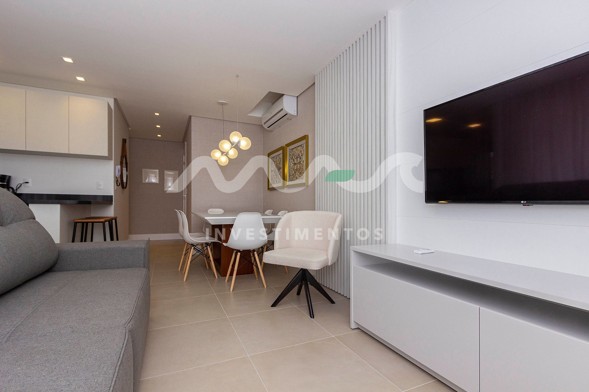Sala de estar, sala de jantar e cozinha completa