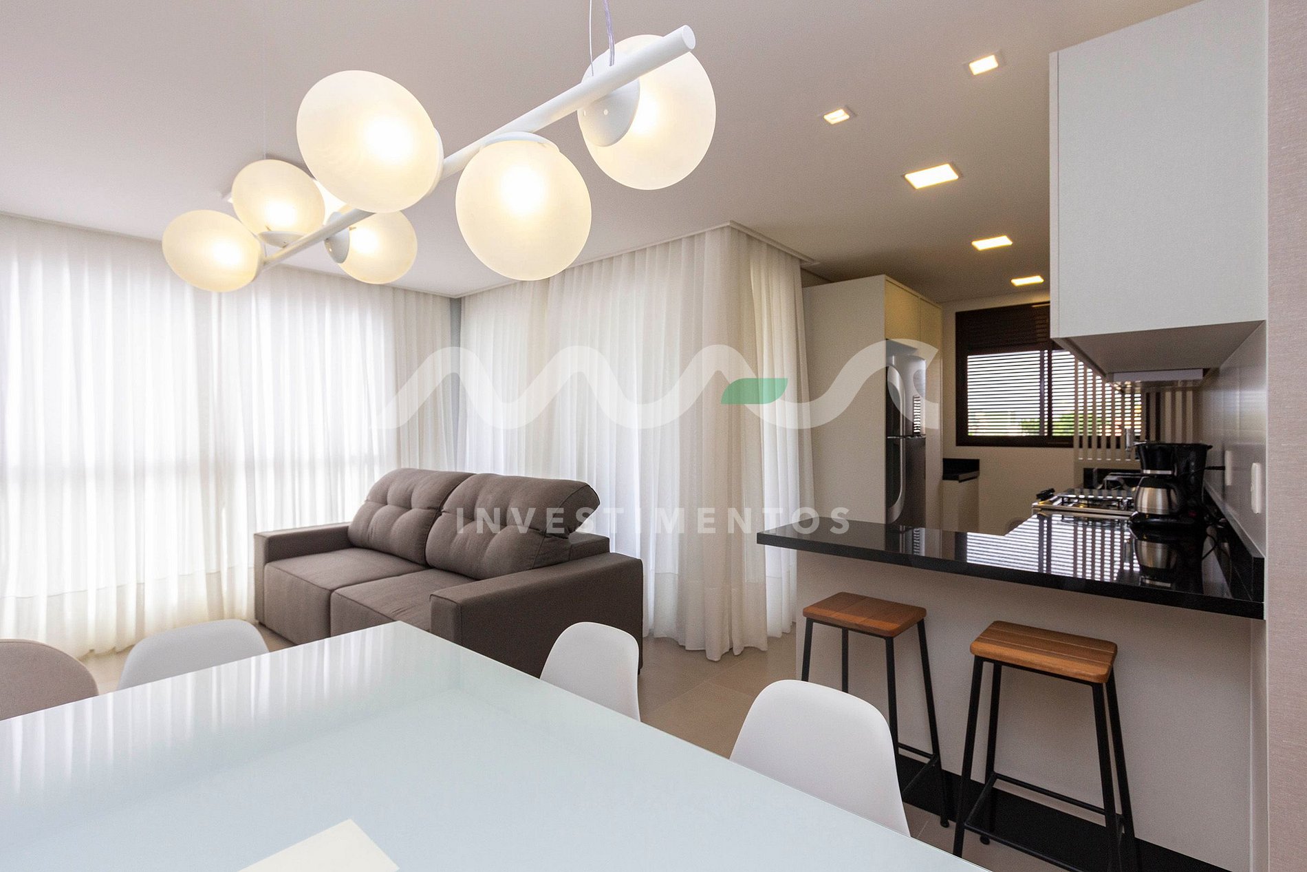 Sala de estar, sala de jantar e cozinha completa