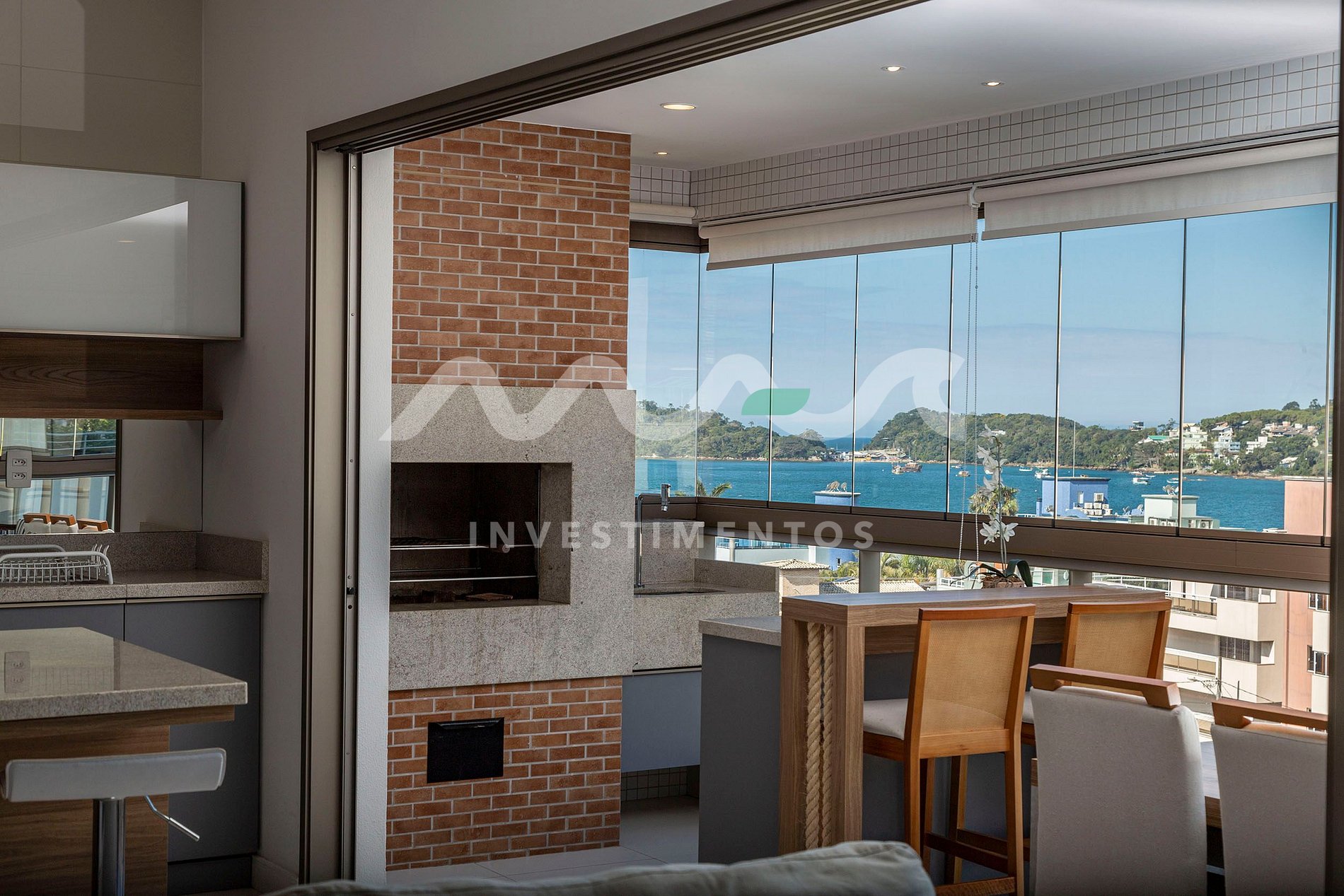Sacada fechada com churrasqueira e vista para a cidade e o mar
