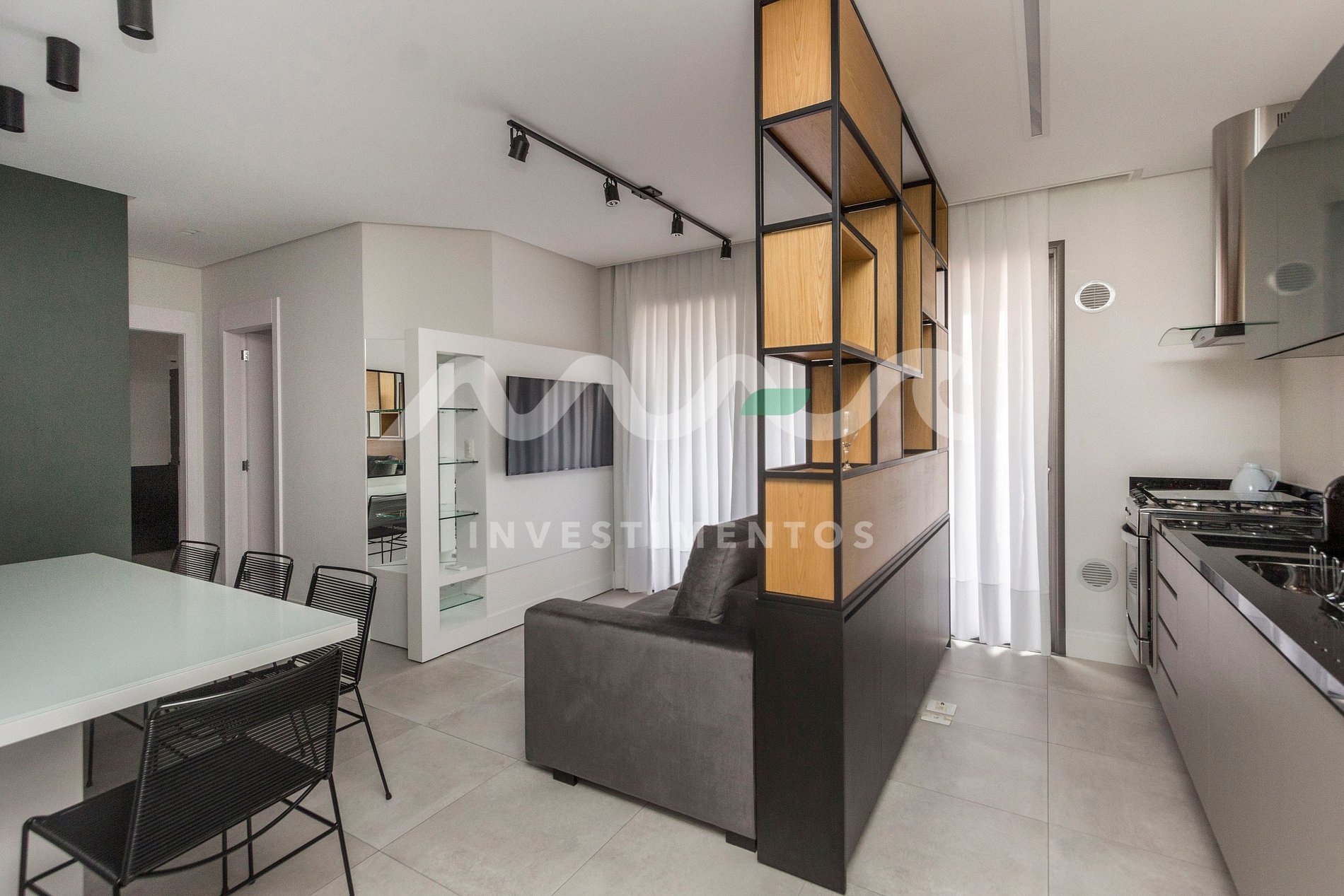 Ambientes amplos e integrados: sala de estar, sala de jantar e cozinha completa