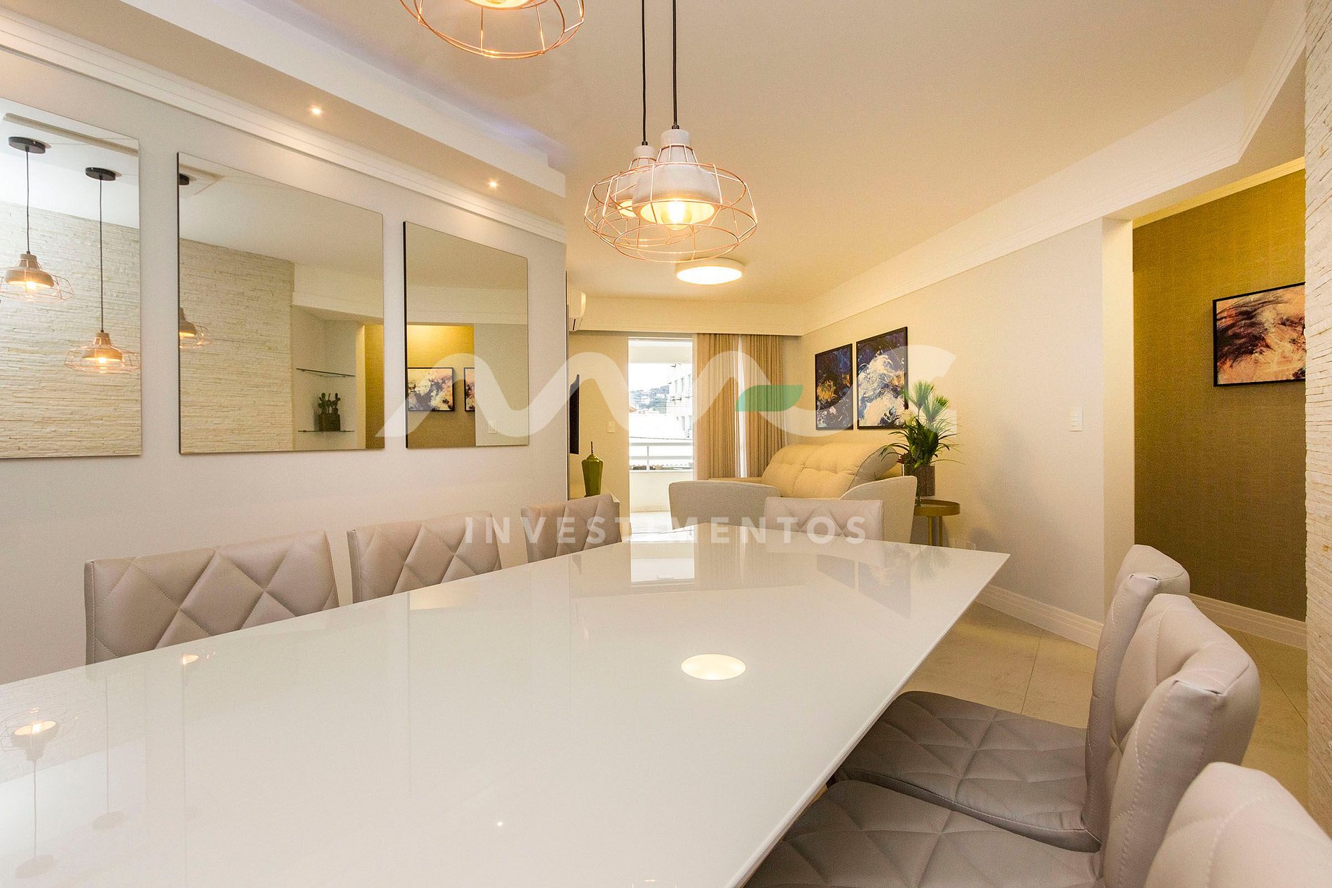 Ambientes integrados e funcionais: sala de estar, jantar e cozinha equipada