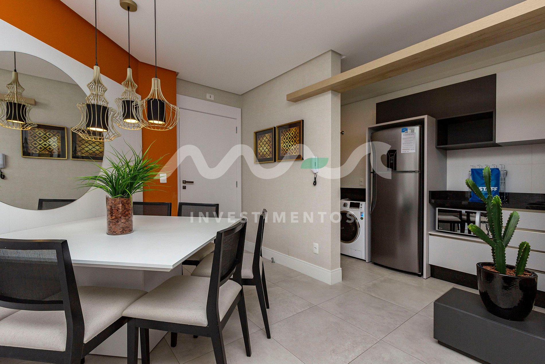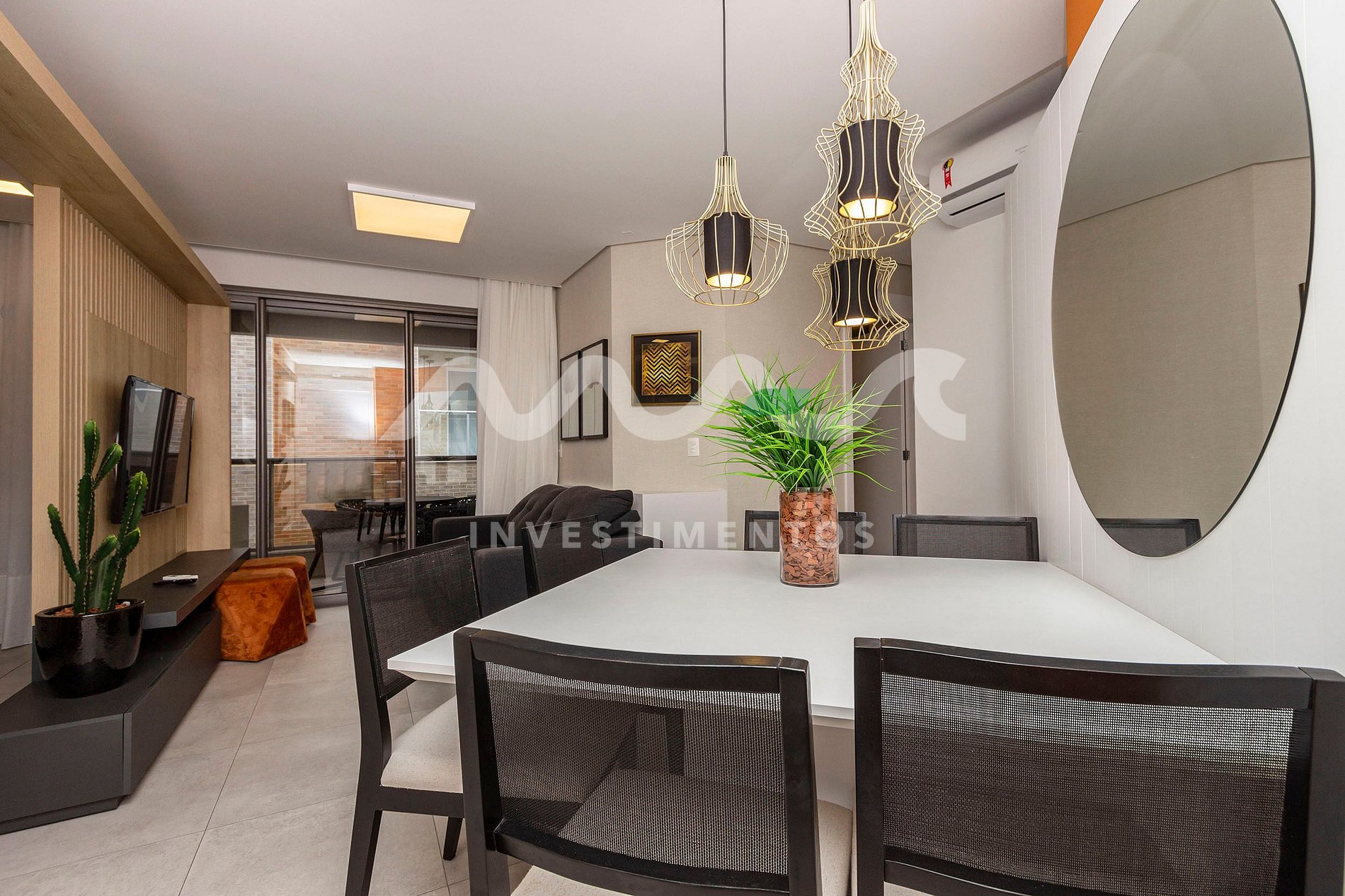 Ambientes amplos e integrados: sala de estar, sala de jantar e cozinha completa